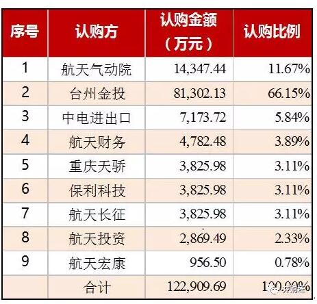 同时,上市公司拟向航天气动院、航天投资、航天财务、航天长征、航天宏康、台州金投、保利科技、中电进出口和重庆天骄等9名特定投资者发行股份募集配套资金不超过12.29亿元。