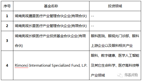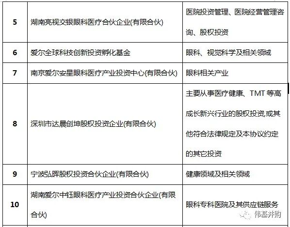 从上面,我们看到了,爱尔眼科在资本市场的买买买,从而业务收入、业务利润的增加,导致市值的飙升,从深层次我们也可以看到爱尔眼科的的投资之道:1、投资并购前:体外收购模式,也就是由爱尔眼科出资10%(或者更少),在联合其他关联基金或者公司以及个人,共同出资组成投资基金,再由该基金定向的并购项目进行投入。并购后在2-3年的时间,让项目盈利并趋于进入稳定状态中后,再由爱尔眼科回购的一种方式。爱尔眼科涉及的基金包括: