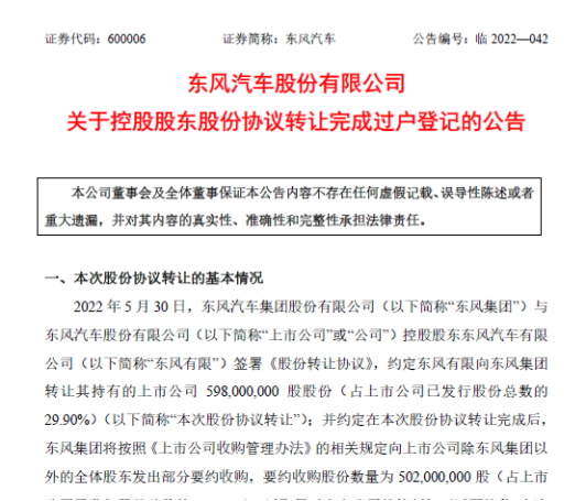 2022年8月27日,东风汽车公告:东风集团和风有限于2022年 8月26日取得中国证券登记结算有限责任公司中国证券登记结算有限责任公司上海分公司出具的《过户登记确认书》, 本次股份协议转让的过户登记手续已办理完成。